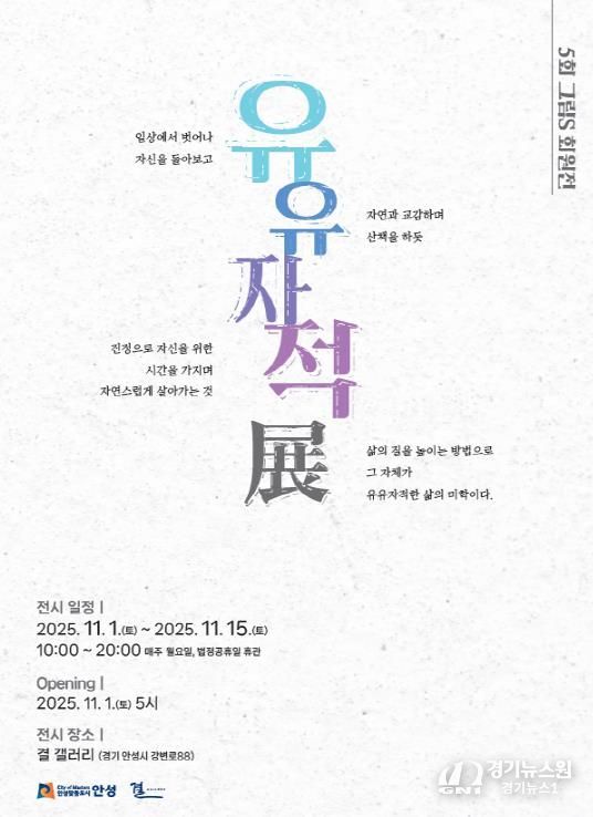 [경기뉴스원/경기뉴스1] | 안성천 우리동네 작은미술관 결갤러리에서는 오는 11월 1일부터 15일까지 그림스아뜰리에 제5회 회원전 ‘유유자적’이 열린다. 이번 전시는 바쁜 일상 속에서 잠시 걸음을 멈추고, 자연과 교감하듯 마음을 산책하는 여유의 시간을 주제로 마련됐다.