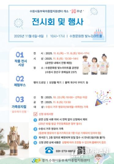 [경기뉴스원/경기뉴스1] | 경기 수원시동부육아종합지원센터는 개소 10주년을 맞아 8일까지 수원문화원 빛누리아트홀에서 문화·예술 중심의 기념행사를 개최한다.