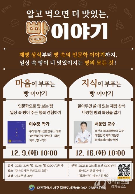 [경기뉴스원/경기뉴스1] | 대전 서구 갈마도서관은 ‘알고 먹으면 더 맛있는 빵 이야기’ 강좌를 운영한다고 24일 전했다.