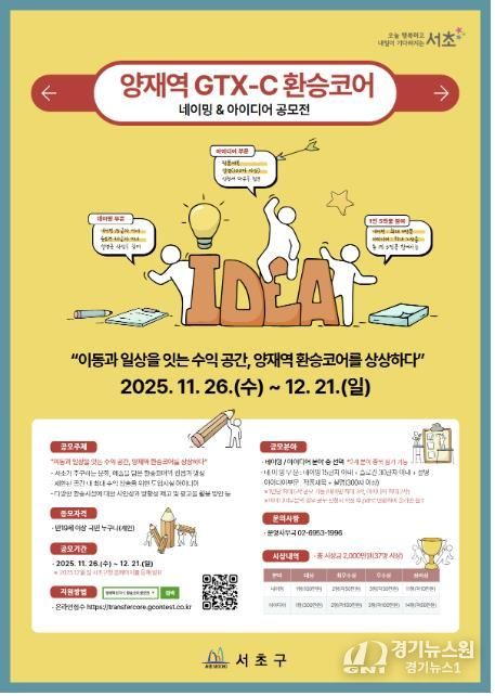 [경기뉴스원/경기뉴스1] | 서울 서초구는 양재역 일대 교통·생활 인프라를 유기적으로 연결하는 핵심시설인 ‘GTX-C 환승코어’를 더욱 창의적이고 매력적인 공간으로 조성하기 위해 '양재역 GTX-C 환승코어 네이밍&아이디어 공모전'을 개최한다고 밝혔다.