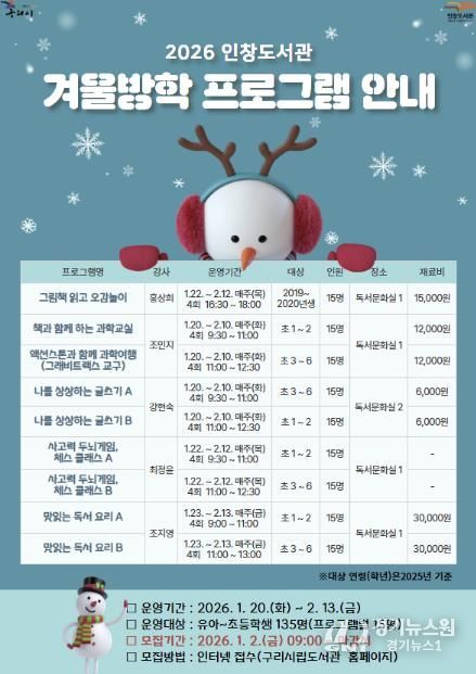[경기뉴스원/경기뉴스1] | 구리시는 겨울방학을 맞은 어린이들을 위해 지역 내 공공도서관 4곳에서 독서를 기반으로 한 창의적이고 체험 중심의 다양한 프로그램을 운영한다.