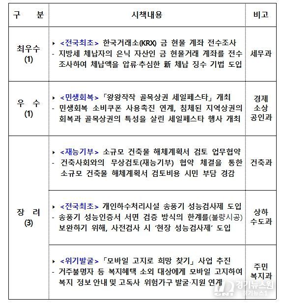 선정된 우수 시책 5건을 구체적으로 살펴보면 ’최우수’ 시책으로는 세무과의 '전국 최초, 한국거래소(KRX) 금 현물 계좌 전수조사'가 선정됐다.