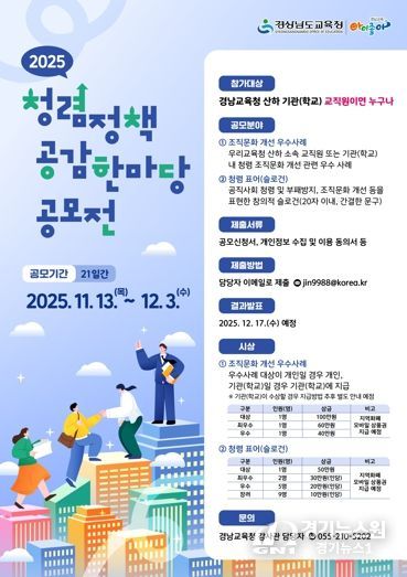 [경기뉴스원/경기뉴스1] | 경상남도교육청은 반부패·청렴 문화를 확산하기 위해 추진한 ‘2025년 청렴 정책 공감 한마당 공모전’의 수상작을 발표했다.