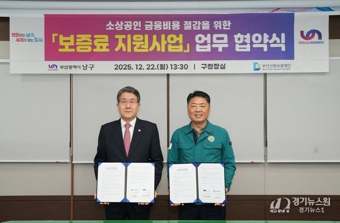 [경기뉴스원/경기뉴스1] | 부산 남구는 부산신용보증재단(이사장 성동화)과 지난 12월 22일 남구청에서 소상공인 경영 안정과 민생경제 활성화를 위한 '남구 소상공인 보증료 지원사업 업무협약'을 체결했다고 밝혔다.