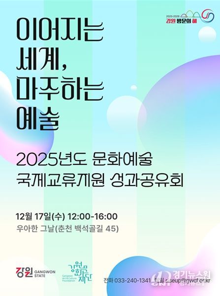 [경기뉴스원/경기뉴스1] | 강원문화재단은 2025년도 문화예술 국제교류지원사업에 참여한 예술인들과 함께 12월 17일 춘천에서 성과공유회 '이어지는 세계, 마주하는 예술' 행사를 성황리에 마무리했다고 밝혔다.