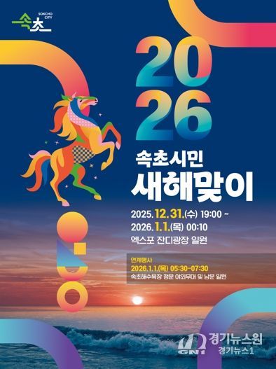 [경기뉴스원/경기뉴스1] | 속초시가 병오년 ‘붉은 말의 해’를 맞아 12월 31일(수) 저녁 7시부터 엑스포 잔디광장 일원에서 ‘2026 속초시민 새해맞이 행사’를 개최한다. 다채로운 프로그램이 이어지며 시민의 안녕과 희망찬 새해 출발을 기원하는 화합의 시간이 될 전망이다.