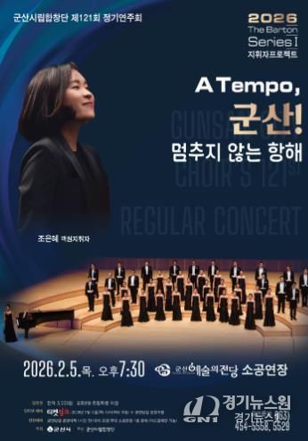 [경기뉴스원/경기뉴스1] | 군산시립합창단이 제121회 정기연주회 〈2026 The Barton Series Ⅰ 지휘자 프로젝트〉 A Tempo, 군산! '멈추지 않는 항해'를 오는 2월 5일 저녁 7시 30분, 군산예술의전당 소공연장에서 개최한다.