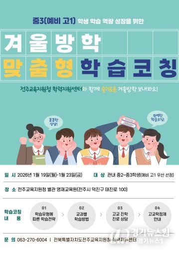 [경기뉴스원/경기뉴스1] | 전북특별자치도전주교육지원청은 학교급 전환기를 맞은 중학교 3학년 학생들의 학습 공백을 최소화하고, 성공적인 고등학교 안착을 돕기 위해 ‘겨울방학 맞춤형 학습코칭’을 운영한다고 15일 밝혔다.