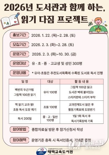 [경기뉴스원/경기뉴스1] | 태백교육도서관(관장 정미라)은 2월 3일부터 10월 30일까지 유아부터 성인까지 전 연령을 대상으로 독서 습관 형성과 지속적인 독서 실천을 지원하기 위해 ‘도서관과 함께하는 읽기 다짐 프로젝트’를 운영한다.