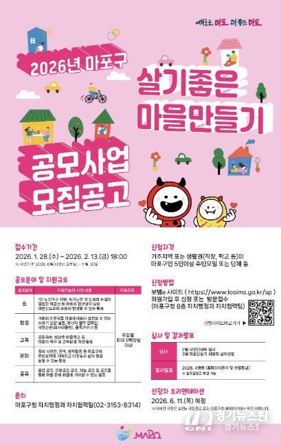 [경기뉴스원/경기뉴스1] | 마포구는 주민이 제안한 아이디어를 지원해 마을공동체 활성화를 도모하는 ‘2026년 마포구 살기좋은 마을만들기 공모사업’ 참여 대상자를 2월 13일까지 모집한다.