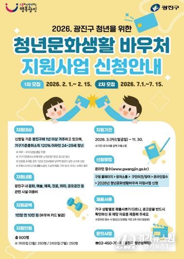 [경기뉴스원/경기뉴스1] | 광진구가 취업을 준비 중이거나 사회에 첫발을 내딛은 청년들의 여가 활동을 지원하기 위해 ‘청년문화생활바우처 지원사업’을 본격 추진한다.