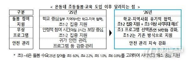 교육부는 2024년부터 늘봄학교 정책을 통해 초등학교 1‧2학년의 돌봄 공백 해소를 집중적으로 지원해 왔다. 2026년부터는 기존의 늘봄학교를 ‘온동네 초등돌봄‧교육’ 정책으로 발전시켜, ①학교와 지역사회가 함께 희망하는 초등학생에게 사각지대 없는 돌봄을 제공하고, ②돌봄보다 교육에 대한 수요가 큰 초등학교 3학년 이상 학생*의 방과후 교육 참여를 중점 지원한다.