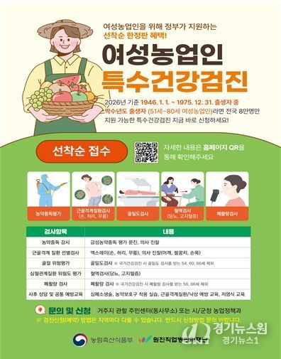 지원 대상은 51세부터 80세까지의 짝수년도 출생 여성농업인으로, 검진비의 10%만 본인이 부담하면 된다. 신청은 거주지 동 주민센터 또는 ‘농업e지’ 앱을 통해 가능하다.