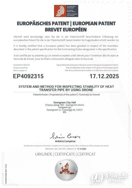 [경기뉴스원/경기뉴스1] | 성남시가 자체 개발한 ‘드론을 이용한 열수송관 안정성 검사 시스템’이 유럽특허(등록번호 EP4092315) 등록을 완료했다고 밝혔다. 이는 시 최초의 해외특허 등록 사례로, 지식재산의 해외 권리화를 통해 유럽 수출길을 여는 계기가 될 것으로 기대된다.