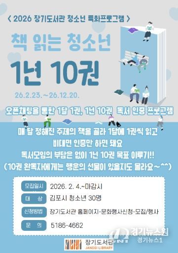[경기뉴스원/경기뉴스1] | 김포시 장기도서관은 청소년의 자발적인 독서 습관 형성을 위해 청소년 특화프로그램 ‘책 읽는 청소년 1년 10권’을 오는 2월 23일부터 연말까지 운영한다.