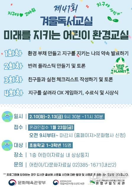 [경기뉴스원/경기뉴스1] | 서울 은평구는 은평구립도서관에서 제41회 겨울독서교실 ‘미래를 지키는 어린이 환경교실’을 운영한다고 밝혔다.