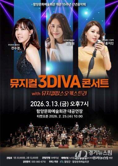[경기뉴스원/경기뉴스1] | 함양문화예술회관은 오는 3월 13일 오후 7시 신년 음악회 ‘뮤지컬 3DIVA’ 콘서트를 개최한다.