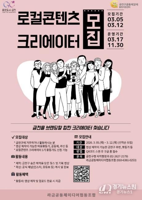 [경기뉴스원/경기뉴스1] | 금천구는 12일까지 지역의 다양한 이야기를 영상 콘텐츠로 제작할 ‘2026 로컬콘텐츠 크리에이터’를 모집한다고 밝혔다.