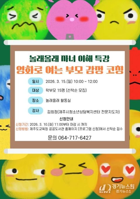 [경기뉴스원/경기뉴스1] | 제주도교육청 제주도서관은 15일 보호자를 대상으로 자녀와의 건강한 소통을 돕기 위한 ‘놀래올래 자녀 이해 특강 : 영화로 여는 부모 감정 코칭’을 운영한다.