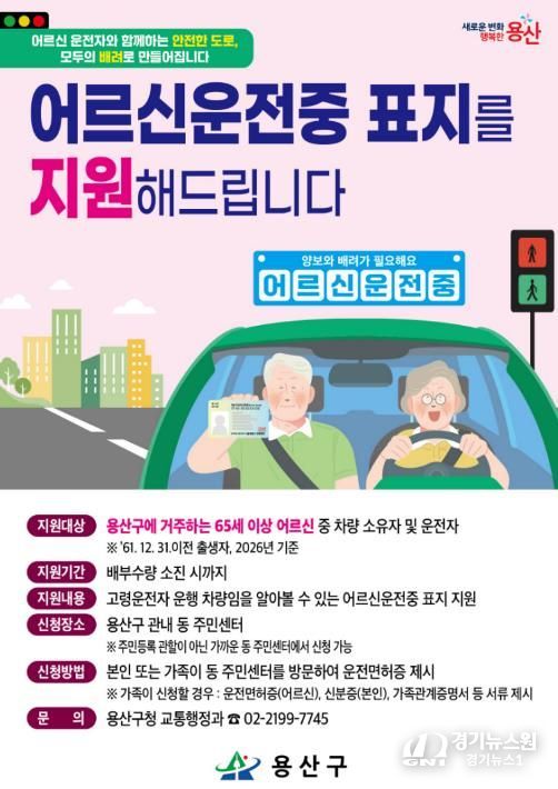 [경기뉴스원/경기뉴스1] | 서울 용산구는 올해도 고령운전자 안전을 위한 ‘어르신 운전중’ 표지 배부 사업을 추진한다고 밝혔다. 지난해 첫 시행에 이어 2년 연속 진행하는 사업으로, 고령 운전자를 배려하는 안전한 교통 환경을 만들기 위한 취지다.