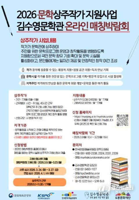 2026 문학상주작가 지원사업은 작가가 문학관에 상주하며 주민을 위한 문학프로그램 운영과 창작 활동을 병행하도록 지원하는 사업이다.