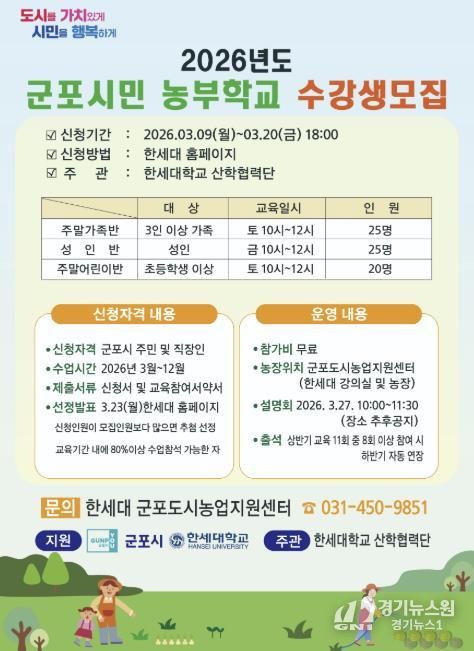[경기뉴스원/경기뉴스1] | 군포시 도시농업 활성화 지원사업 보조사업자인 한세대학교가 오는 3월 20일까지 2026년도 군포시민 농부학교 신규 수강생을 모집한다고 밝혔다.