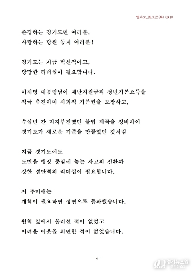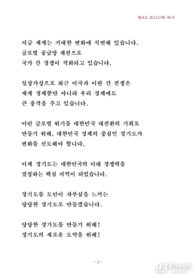 그는 “지금 경기도는 정체 구간에 머물러 있으며, 도민의 삶과 산업 환경이 세계적인 수준의 기대치에 못 미치고 있다. 이를 바꾸기 위해서는 강력한 리더십과 결단력이 필요하다”고 강조했다.