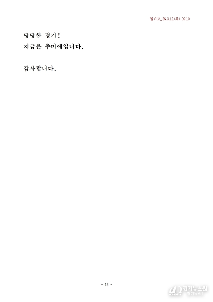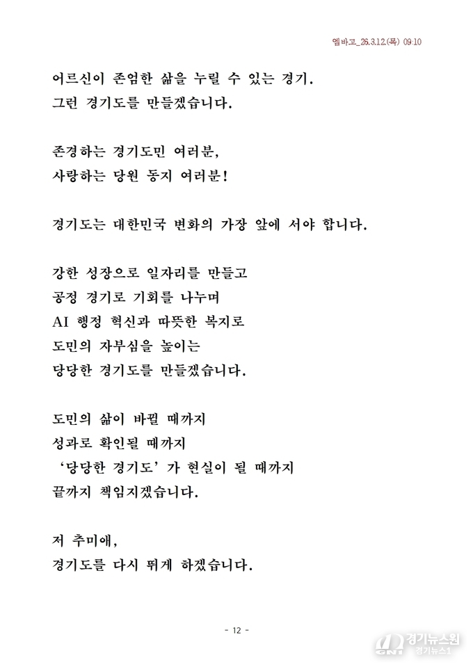 또한 교통, 복지, 산업, AI 행정 등 도정 전반에 걸친 구체적 계획을 언급하며, “저 추미애가 경기도를 다시 뛰게 하겠다. 당당한 경기도, 1등 경기도를 만들겠다”고 다짐했다.
