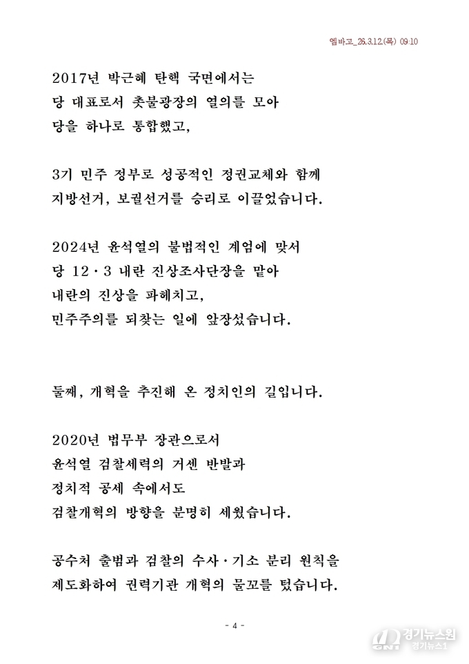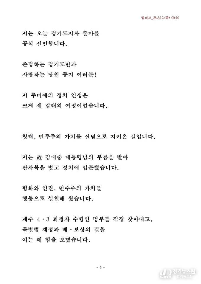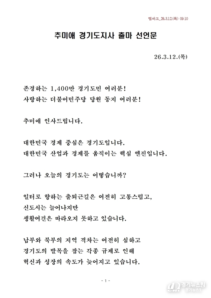 3월 12일, 더불어민주당 추미애 전 법무부 장관이 경기도지사 예비후보로 공식 출마를 선언하며 경기도를 대한민국 경제·행정 변화의 중심으로 만들겠다는 비전을 밝혔다.