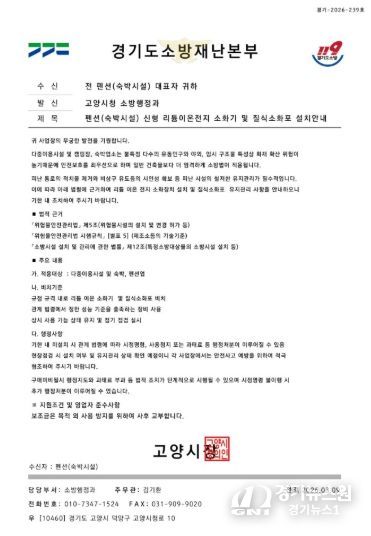 시는 최근 '소방시설 설치 및 관리에 관한 법률'등을 근거로 리튬이온 전지 소화장치 설치 및 질식소화포 유지관리 의무가 있다며, 고양시를 사칭한 공문서를 제시하고 일산서구 소재 숙박업소에 접근했다는 제보를 받았다.