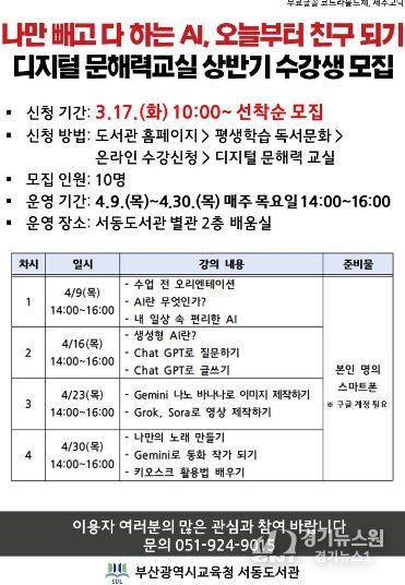 [경기뉴스원/경기뉴스1] | 부산광역시교육청서동도서관(관장 이진옥)은 오는 4월 9일부터 30일까지 매주 목요일 서동도서관 별관에서 지역 주민 10명을 대상으로 상반기 디지털 문해력 교실 ‘나만 빼고 다 하는 AI, 오늘부터 친구되기’를 운영한다.