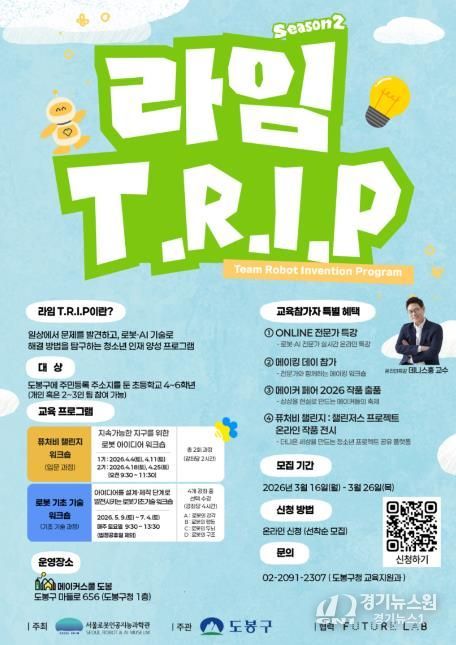 [경기뉴스원/경기뉴스1] | 서울 도봉구가 서울로봇인공지능과학관(RAIM)이 주최하는 '2026년 RAIM T.R.I.P(동행 로봇 발명프로그램)' 참여 자치구로 선정됐다고 밝혔다.