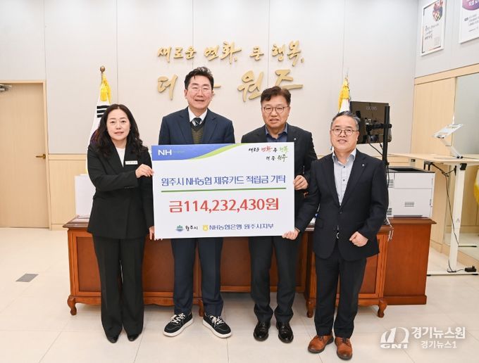 [경기뉴스원/경기뉴스1] | 원주시는 지난 24일 시청에서 원강수 시장, 김주석 NH농협 원주시지부장 등이 참석한 가운데 NH농협 제휴카드 적립금 전달식을 가졌다.