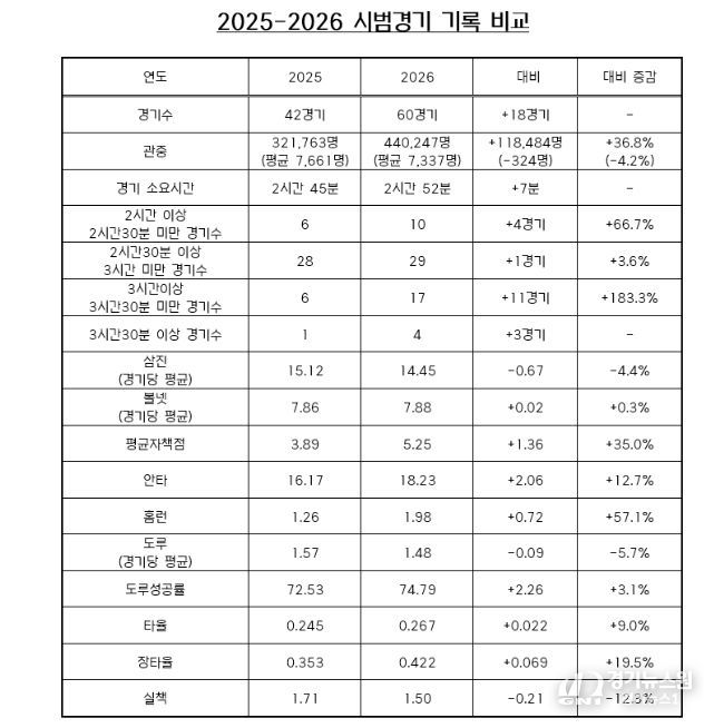[경기뉴스원/경기뉴스1] | 3월 24일(화) 막을 내린 2026 KBO 시범경기는 60경기에 총 44만 247명의 관중이 입장해 역대 시범경기 단일시즌 최다 관중 기록을 경신했다. 종전 기록은 2025년에 기록한 32만 1,763명이었다.