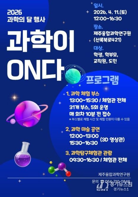 [경기뉴스원/경기뉴스1] | 제주도교육청 제주융합과학연구원은 과학의 달을 맞아 11일 연구원 일원에서 도민과 함께하는 2026년 과학의 달 행사 ‘과학이 온(ON)다’를 개최한다.