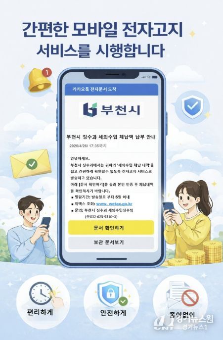 [경기뉴스원/경기뉴스1] | 부천시는 이달 20일부터 시민 납세 편의를 높이고 고지서 전달의 정확성을 강화하기 위해 세외수입(일반회계) 체납안내문을 카카오톡으로 발송하는 모바일 전자고지 서비스를 시행한다.