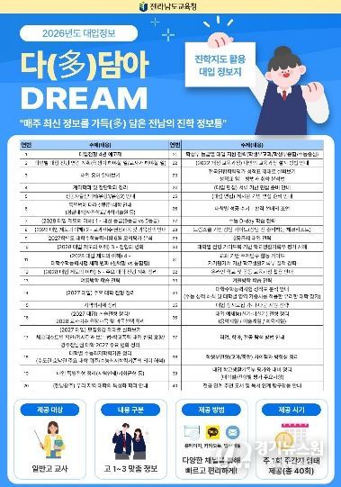 [경기뉴스원/경기뉴스1] | 전라남도교육청이 급변하는 대입 환경에 선제적으로 대응하고 학교 현장의 진학지도 역량을 강화하기 위해 맞춤형 대입 정보지 ‘다(多)담아 DREAM’을 발간·운영한다.