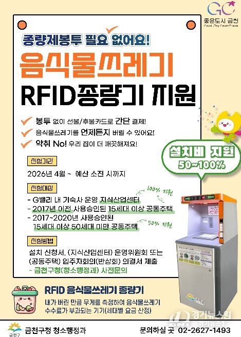 [경기뉴스원/경기뉴스1] | 금천구는 생활폐기물 직매립이 금지됨에 따라 음식물쓰레기 혼합배출을 예방하고 배출량을 줄이기 위해 2026년 음식물쓰레기 자동계량장비(RFID) 종량기 설치 지원을 신청받는다고 밝혔다.