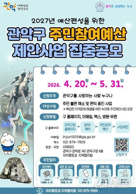 [경기뉴스원/경기뉴스1] | 관악구가 지역사회 문제를 해소하고 주민 편익을 증진하기 위해 ‘2026년도 주민참여예산사업 및 협치의제’ 공모를 실시한다.