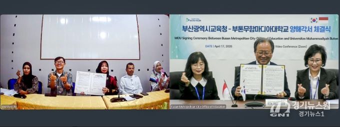 [경기뉴스원/경기뉴스1] | 부산광역시교육청은 지난 17일 인도네시아 부톤무함마디아대학교(총장 와 오데 알 자릴리아니, Wa Ode Al Zarliani)와 ‘한국어 교육 활성화 및 문화교류 증진을 위한 양해각서’를 온라인 화상회를 통해 체결했다고 밝혔다.
