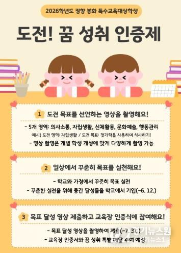 [경기뉴스원/경기뉴스1] | 봉화교육지원청은 4월 20일 '장애인의 날'을 기념하여, 경상북도 내 최초로 특수교육대상학생의 특성을 반영해 전면 개편한 2026학년도 정향 봉화 특수교육대상학생 '도전! 꿈 성취 인증제' 참가 신청을 받고 본격적인 운영에 돌입한다고 밝혔다.