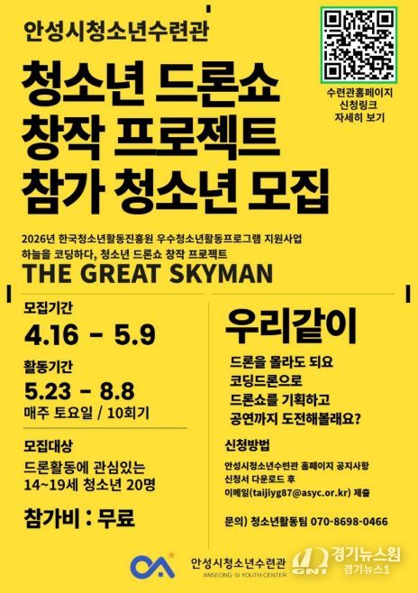 [경기뉴스원/경기뉴스1] | 안성시청소년수련관은 미래 디지털 인재 양성을 위한 청소년 참여형 프로그램 '하늘을 코딩하다, 청소년 드론쇼 창작 프로젝트 ‘THE GREAT SKYMAN’'에 참여할 청소년을 4월 16일 ~ 5월 8일까지 모집한다고 밝혔다.