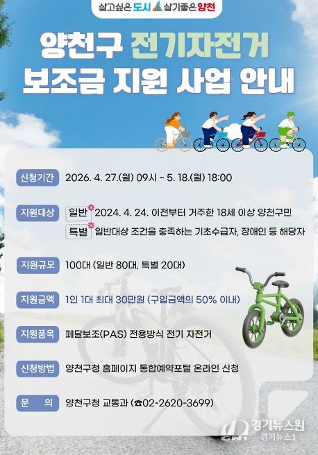 [경기뉴스원/경기뉴스1] | 양천구는 탄소중립 실천과 구민의 이동 편의 증진을 위해 서울시 자치구 가운데 유일하게 시행 중인 ‘전기자전거 구입 보조금 지원사업’을 올해도 지속 추진한다고 27일 밝혔다.