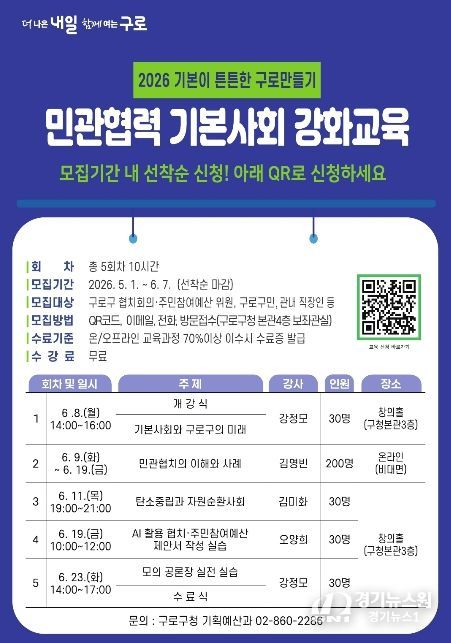 [경기뉴스원/경기뉴스1] | 구로구가 오는 6월 민관협치 활성화와 주민참여 확대를 위해 ‘민관협력 기본사회 강화교육’을 운영하고 5월 1일부터 교육생을 선착순으로 모집한다.
