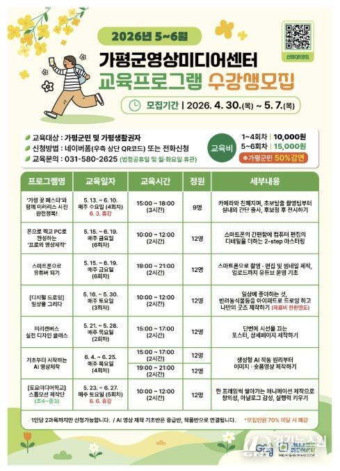 [경기뉴스원/경기뉴스1] | 가평군영상미디어센터가 군민들의 영상 미디어 콘텐츠 역량 강화를 위해 ‘5~6월 미디어 교육 프로그램’ 수강생을 4월 30일부터 선착순으로 모집한다.