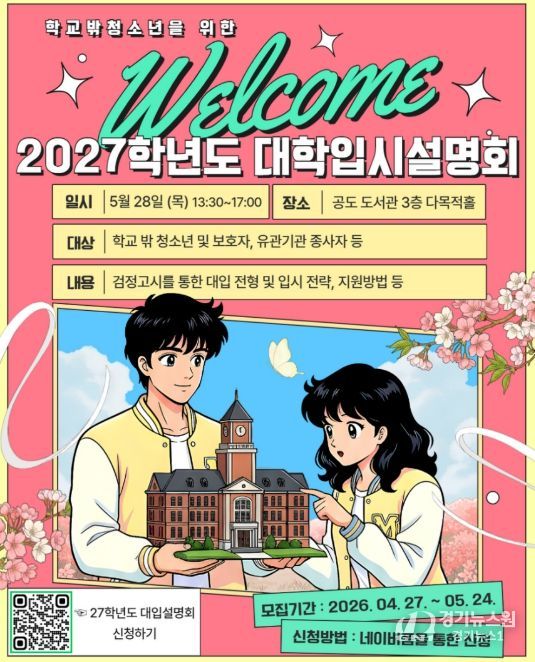 [경기뉴스원/경기뉴스1] | 안성시학교밖청소년지원센터는 학교 밖 청소년의 성공적인 진학을 돕기 위해 오는 5월 28일 오후 1시 30분부터 공도 도서관 다목적홀에서 ‘2027학년도 대학 입시 설명회’를 개최한다고 밝혔다.