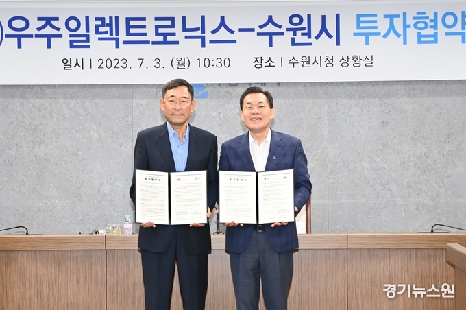 수원시는 3일 시청 상황실에서 우주일렉트로닉스와 ‘본사와 연구소 이전을 위한 투자 협약’을 체결했다.