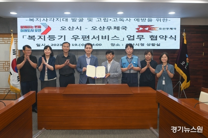 경기뉴스원 | 오산시(시장 이권재)가 지난 19일 시청 상황실에서 복지사각지대 발굴 및 고립·고독사 예방을 위해 오산우체국(국장 김용대)과 ‘복지등기우편서비스’업무협약을 체결했다고 밝혔다.