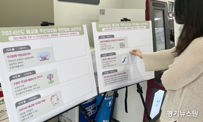 매교동 주민총회 의제는 총 6건이다. 사전투표와 현장투표를 통해 집계된 결과를 통해 사업의 우선순위를 결정한다. 사전투표는 ▲새빛톡톡-설문투표-‘2024년 매교동 마을자치 계획’ 또는 ▲매교동행정복지센터 방문 후 스티커로 참여 가능하며, 14일부터 25일까지 14일간 진행된다. 현장 투표는 총회 현장에 참석하여 참석자명부 작성 후 투표할 수 있다.