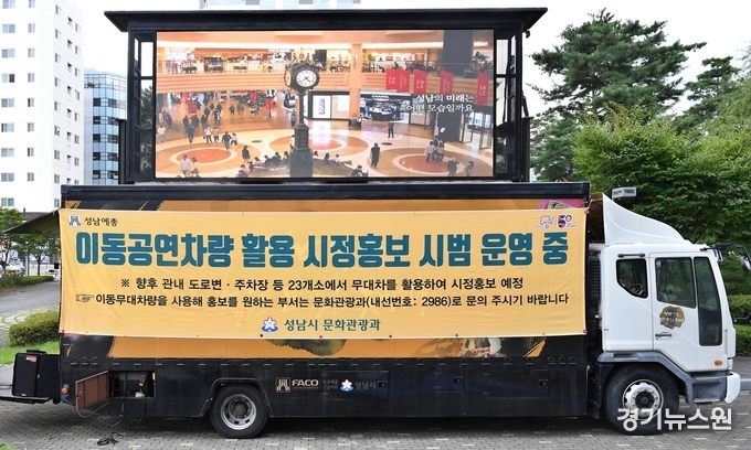 성남시(시장 신상진)는 10월부터 이동무대차량의 대형스크린을 활용해 각종 시정 및 주요 행사일정을 시민이 많이 모이는 장소에 직접 찾아가 홍보할 계획이라고 18일 밝혔다.